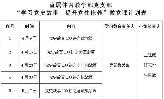 本次以《党史故事100讲》为主要学习内容,以学习小组为单位、学习强国线上微党课的形式开展学习教育活动,以期树牢艰苦奋斗思想,领会艰苦奋斗意志,增强党性修养、党员意识。参加党日活动的成员为本支部党员及入党积极分子。请各学习小组组长按学习计划(计划时间表详见附件)召开微党课交流会。