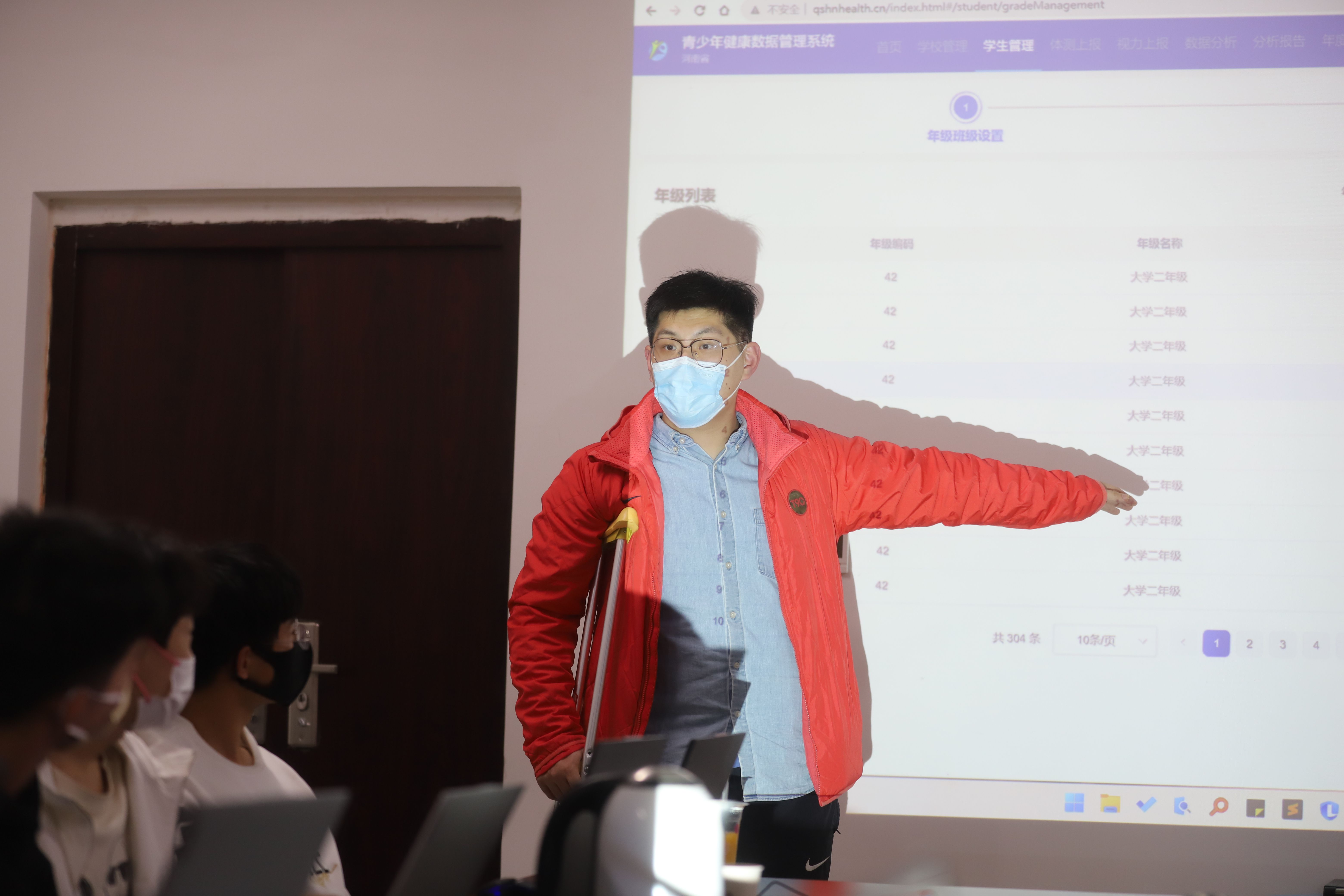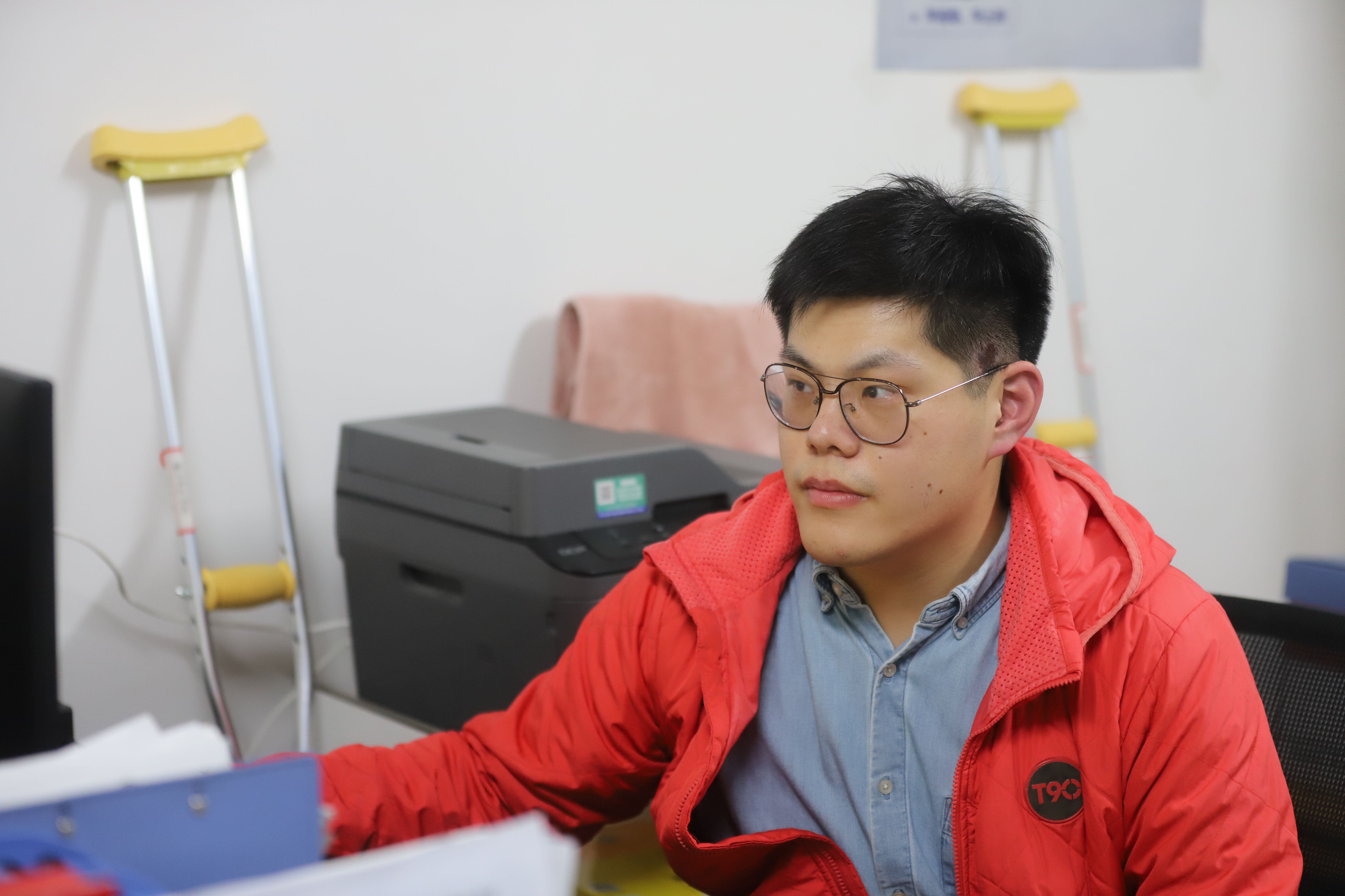 在这9人当中,有一位拄着双拐的老师,因为自己是党员,所以他婉拒了体育教学部领导的照顾,毅然决然的选择留在工作岗位上,他就是宋子恒。