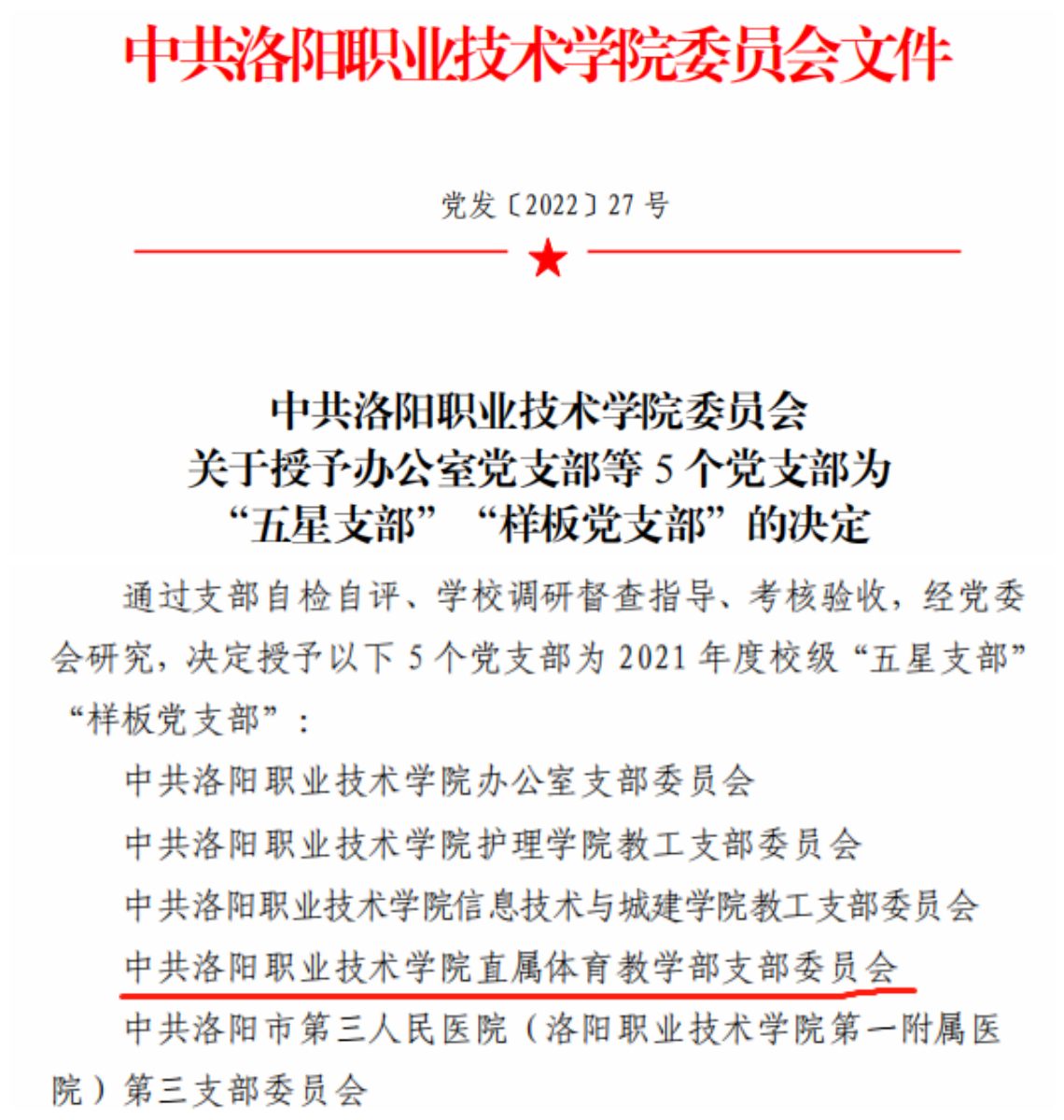 2021年,直属体育教学部党支部按照五星支部创建行动计划要求,结合自身实际,制定建设标准,对照标准自查自建,确定建设目标,细化任务举措,积极争创“五星支部”“样板党支部”。通过支部自检自评、学校调研督查指导、考核验收,最后经校党委会研究,决定授予中共洛阳职业技术学院直属体育教学部支部委员会等5个党支部为2021年度校级“五星支部”“样板党支部”。