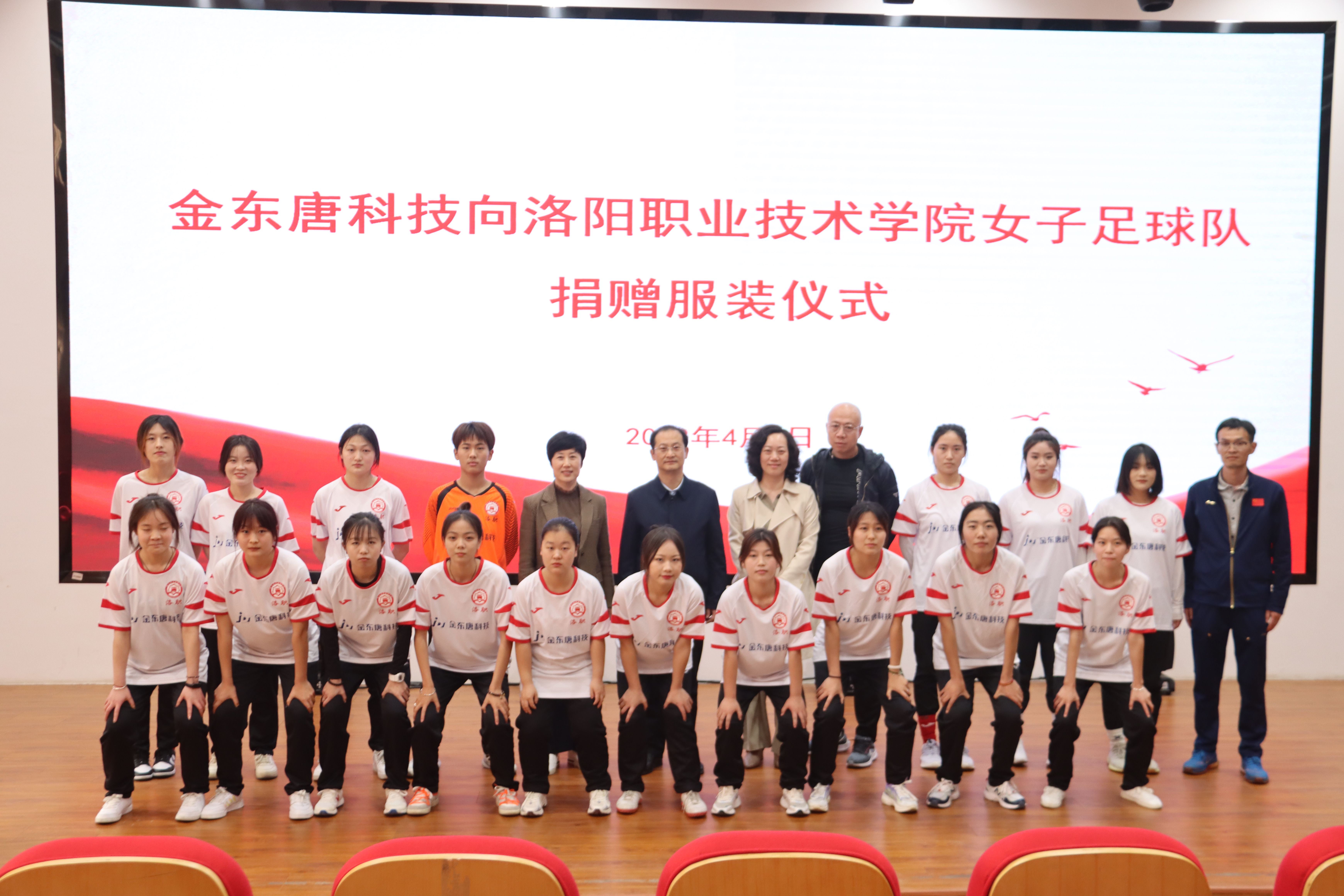 4月6日下午,金东唐科技公司向洛阳职业技术学院女子足球队捐赠服装仪式在大学生活动中心二楼心理剧场进行。洛阳职业技术学院副校长李保安、体育教学部主任王莉、金东唐科技河南区域总监杨洛芬,洛职女子足球队主教练唐泽宇以及女子足球队全体队员参加捐赠仪式。