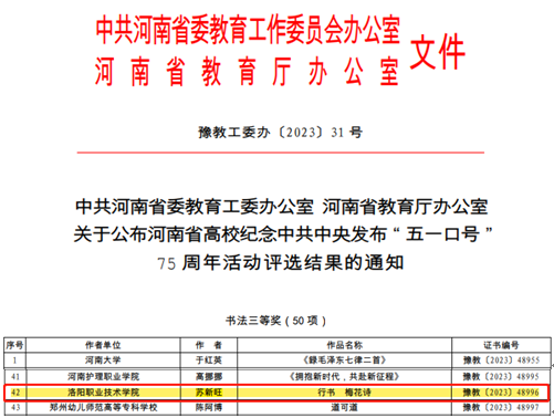 近日,省委教育工委、省教育厅公布了河南省高校纪念中共中央发布“五一口号”75周年活动评选结果,体育教学部的民主党派教师苏新旺《行书 梅花诗》的作品喜获书法三等奖。