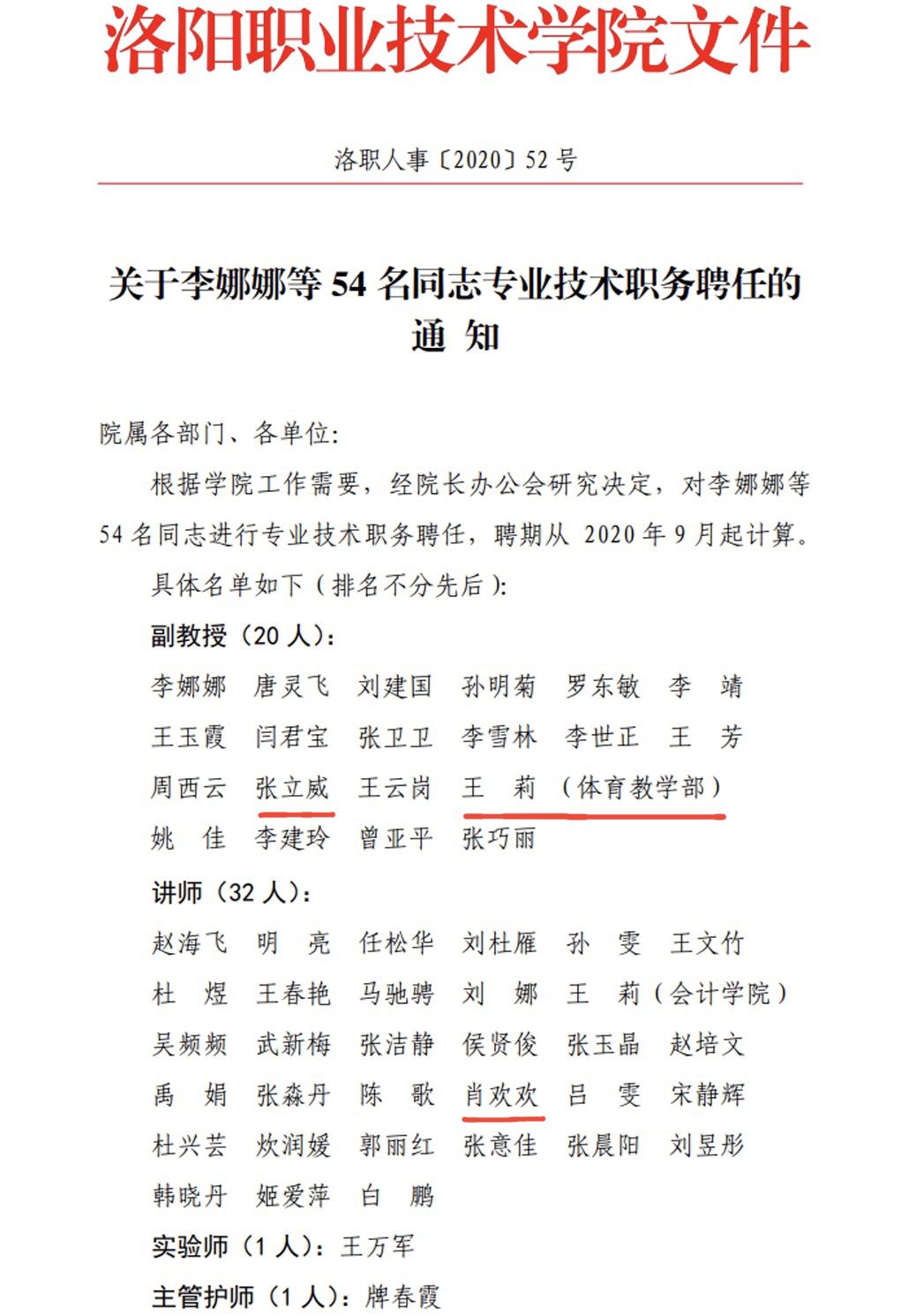 12月25日,按照《洛职人事〔2020〕52号》文件规定,根据学院工作需要,经院长办公会研究决定,对肖欢欢同志进行高校讲师职务聘任,聘期从2020年9月起计算。