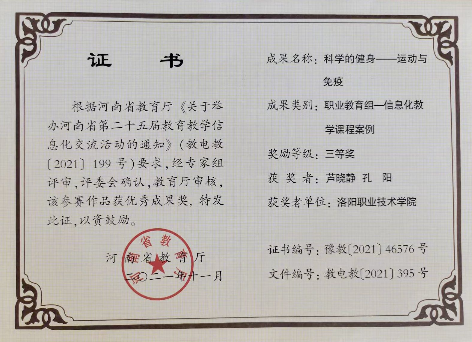 11月22日,根据河南省教育厅《关于举办河南省第二十五届教育教学信息化交流活动的通知》(教电教[2021]199号)要求,经专家组评审、评委会确认、教育厅审核,我部芦晓静、孔阳两位老师在“职业教育组——信息化教学课程案例”中的《科学的健身——运动与免疫》作品荣获三等奖。