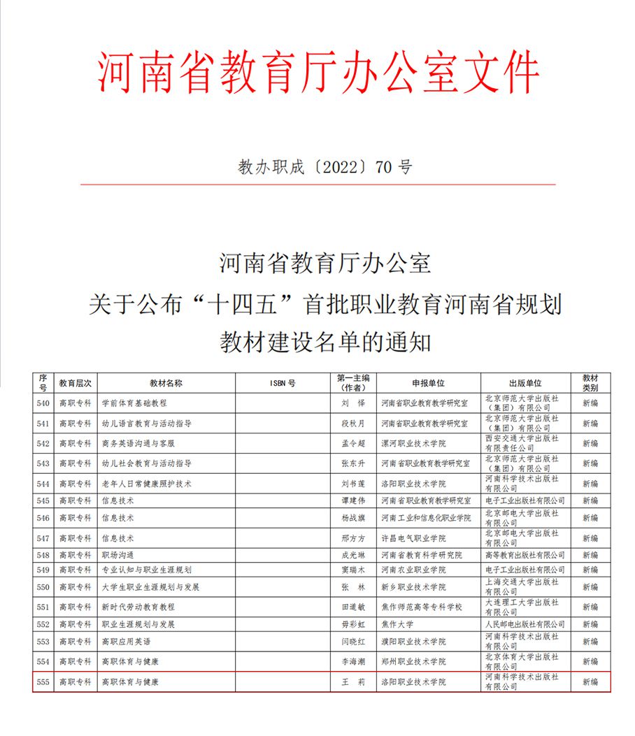 3月22日,在公布的项目名单中,我校体育教学部教学团队申报的《高职体育与健康》教材获批“十四五”首批职业教育河南省规划教材建设项目。