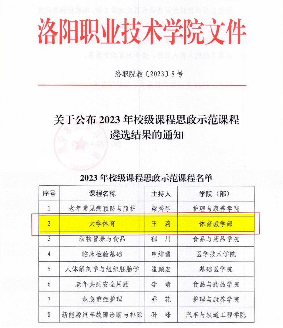 4月24日,在公布的项目名单中,体育教学部教学团队申报的《大学体育》课程获批2023年校级课程思政示范课程。