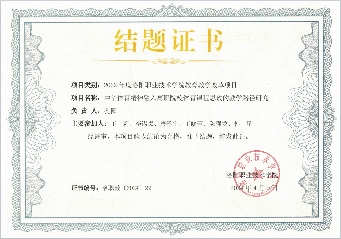 2022年11月27日,在公布的项目名单中,孔阳老师团队申报的《中华体育精神融入高职院校体育课程思政的教学路径研究》获批我校2022年度教育教学改革拟立项项目。2024年4月9日,经评审,本项目验收结论为合格,准予结题。