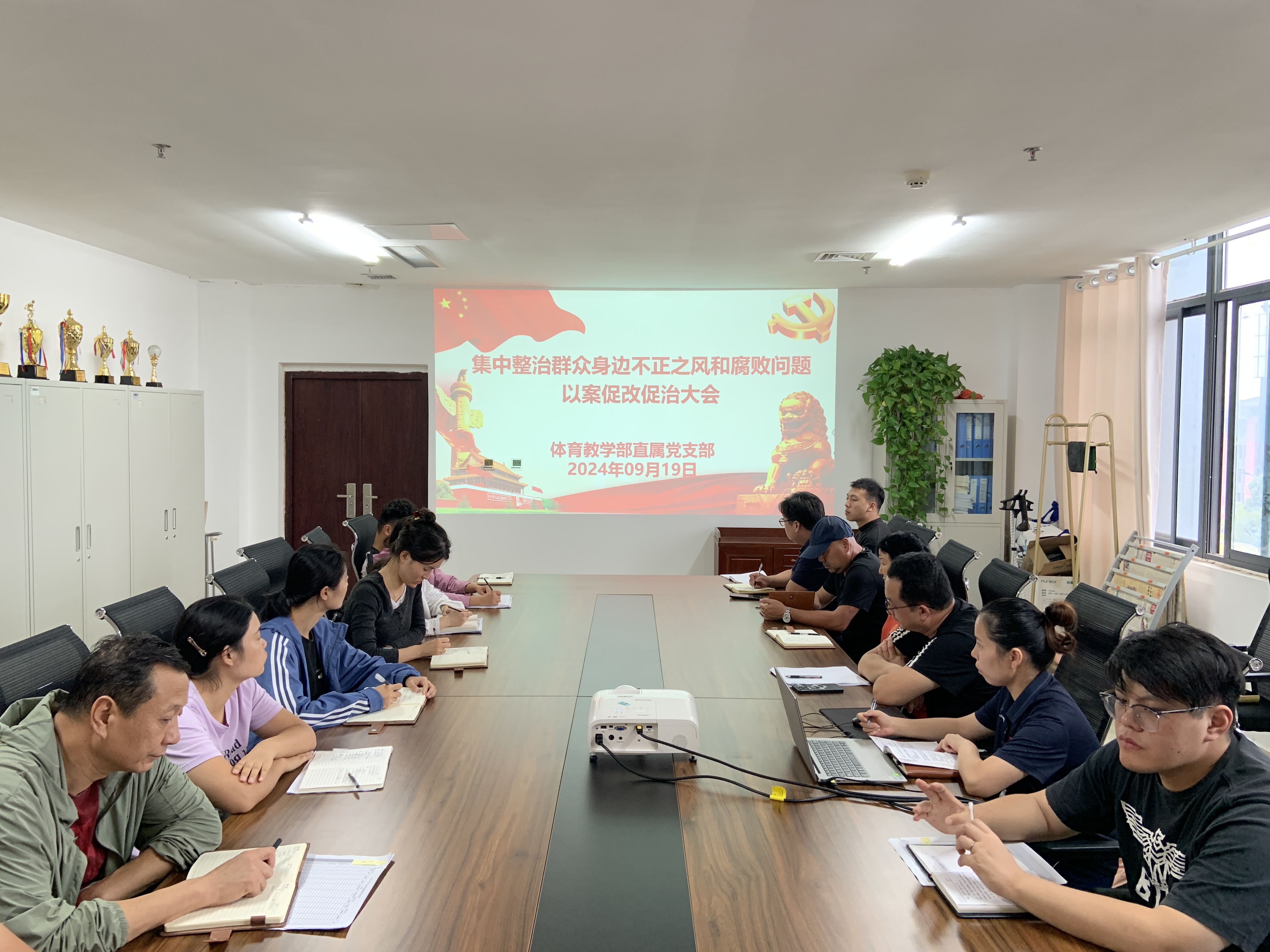 为深入贯彻落实党中央关于全面从严治党的决策部署,认真落实有关集中整治群众身边不正之风和腐败问题的安排部署,按照省教育厅关于在全省教育系统开展以案促改促治工作要求,结合我校实施方案通知,9月19日,体育教学部直属党支部组织全体教师在部门教研室召开集中整治群众身边不正之风和腐败问题以案促改促治大会,会议由支部书记王莉主持。