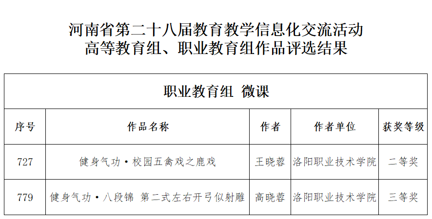10月22日,根据《河南省教育厅办公室关于举办河南省第二十八届教育教学信息化交流活动的通知》要求,经各单位申报、专家评审、结果公示,我部在“职业教育组-微课”中申报的两项作品喜获佳绩。王晓蓉老师申报的《健身气功·校园五禽戏之鹿戏》作品荣获二等奖,高晓蓉老师申报的《健身气功·八段锦 第二式左右开弓似射雕》作品荣获三等奖。