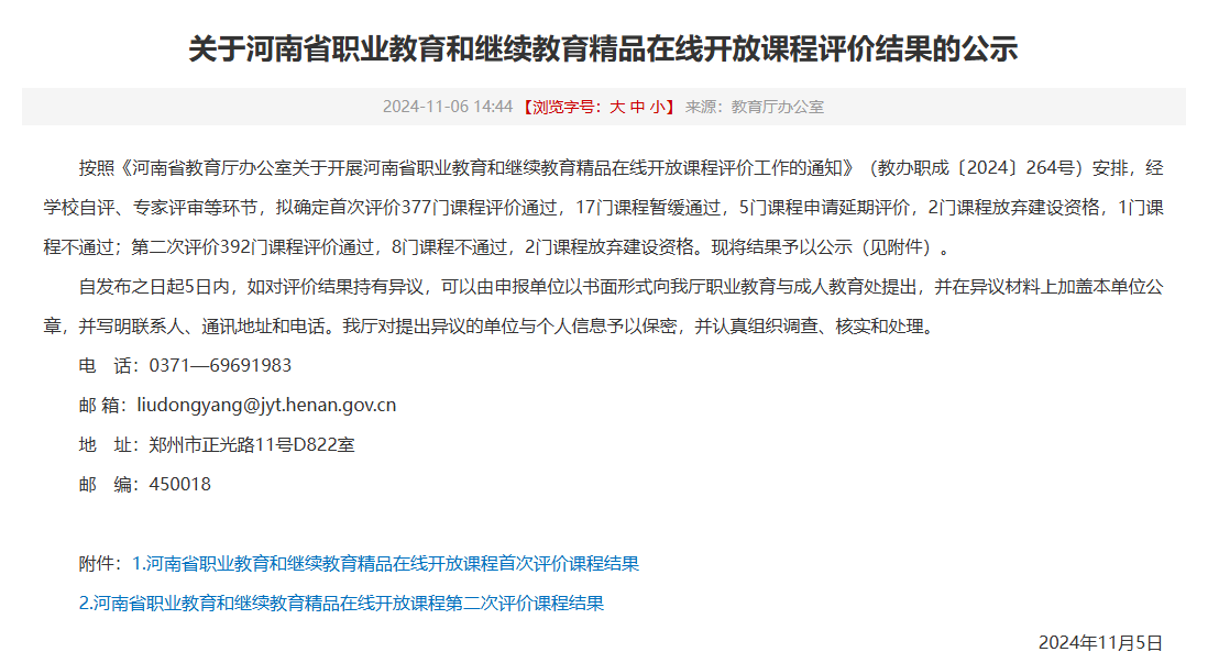 按照《河南省教育厅办公室关于开展河南省职业教育和继续教育精品在线开放课程评价工作的通知》安排,经学校自评、专家评审等环节,11月5日,河南省教育厅正式公布了评价结果。