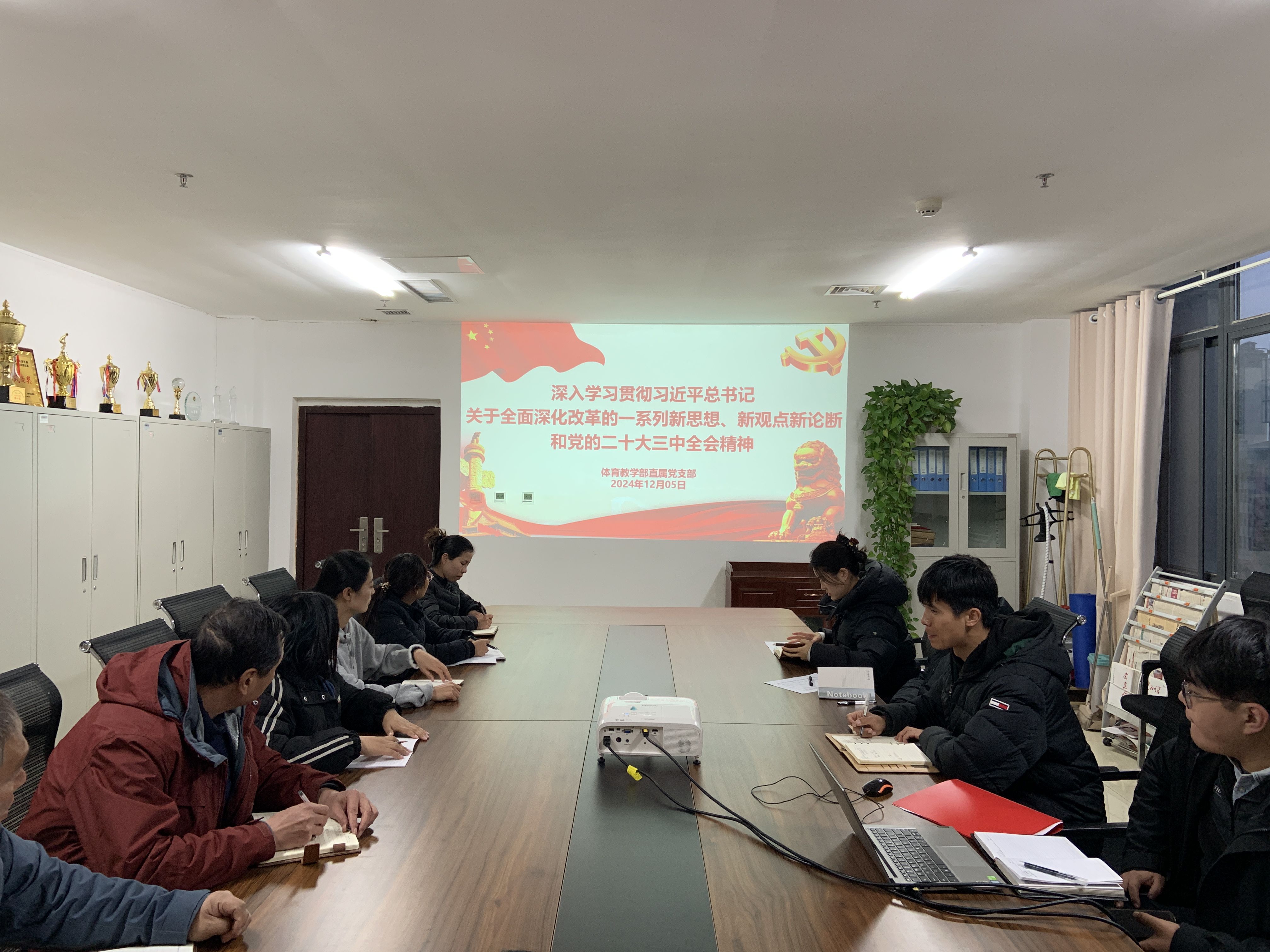 为深入学习宣传贯彻党的二十届三中全会精神,根据学校党委组织部工作要求,12月5日,体育教学部直属党支部组织全体教师在部门教研室开展深入学习贯彻习近平总书记关于全面深化改革的一系列新思想、新观点、新论断和党的二十届三中全会精神集中学习,会议由支部书记王莉主持。