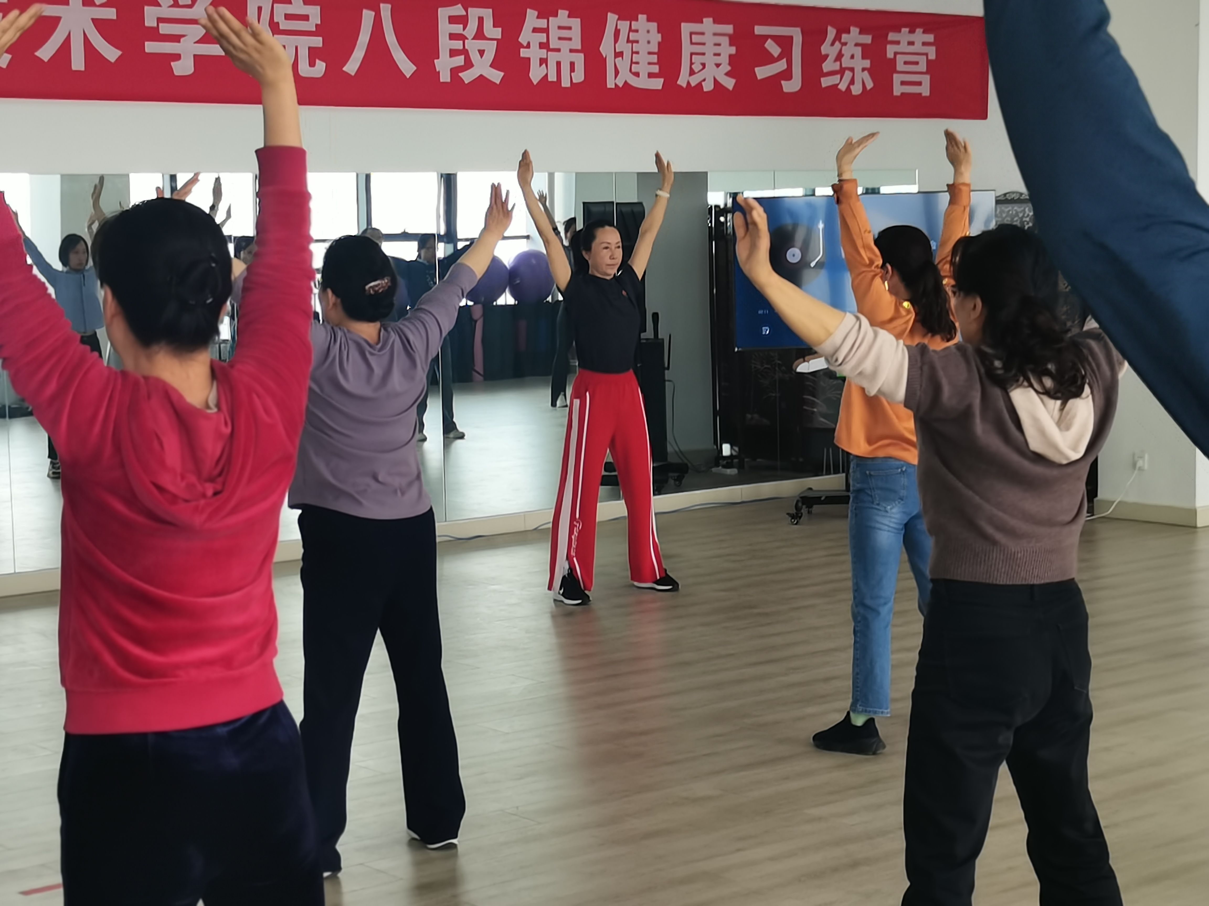 祝京媛以《健身气功·八段锦动作特点》、《健身气功·八段锦易犯错误》为题,对步法、手法、身法等方面进行了详细讲解,随后又向大家介绍了动作中的呼吸节奏以及穴位的按压,使各位老师对健身气功·八段锦有了全新的认识。最后,在祝京媛的带领下,全体师生进行了健身气功·八段锦的练习。