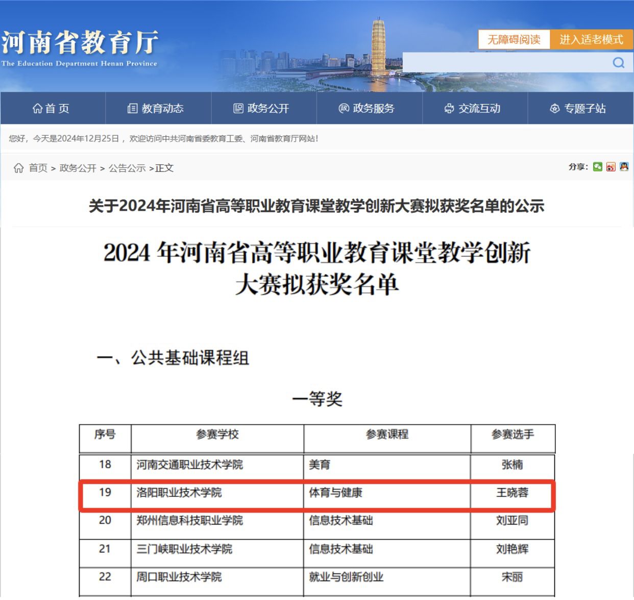 2024年11月26日至28日,由河南省教育厅主办的2024年河南省高等职业教育课堂教学创新大赛(公共基础课程组)在商丘医学高等专科学校举行,体育教学部教师王晓蓉荣获一等奖。