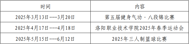 根据学校体育运动委员会工作计划,本学期将举办以下比赛,请各二级学院积极准备,按时参加。