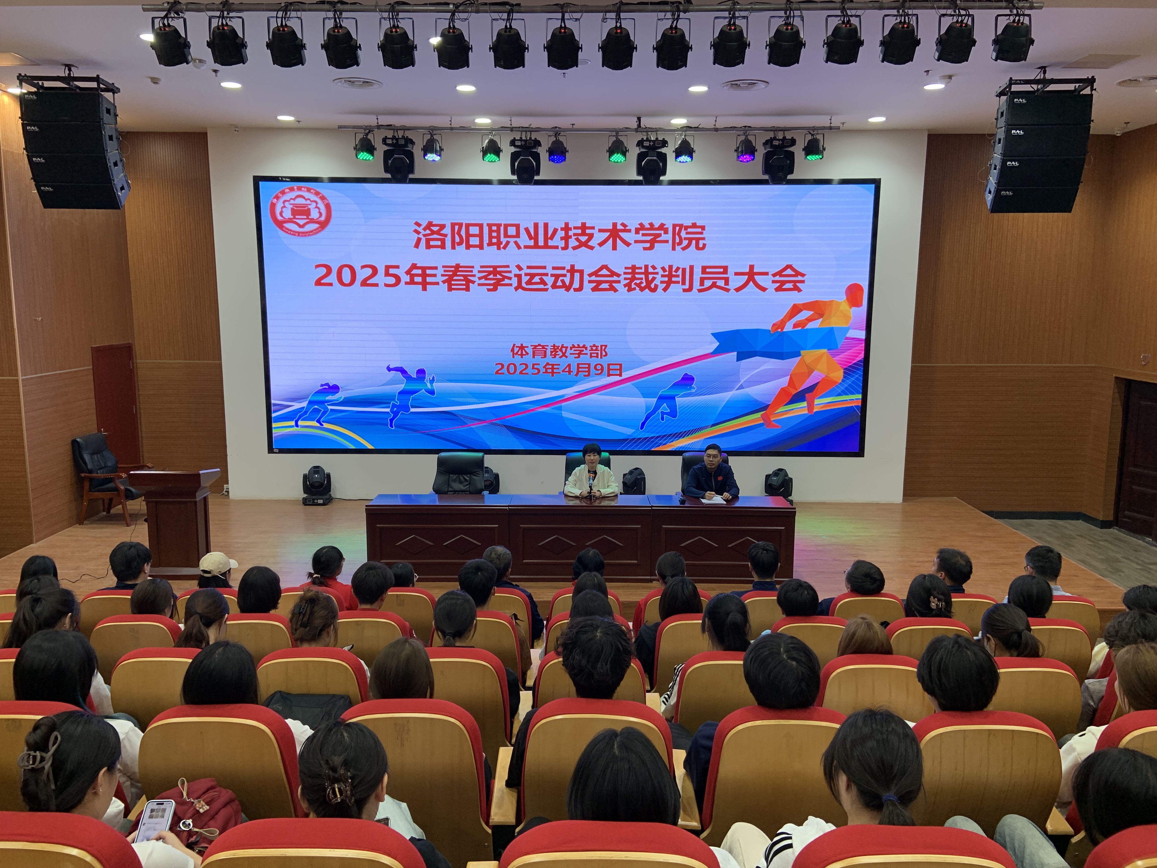 为进一步推动运动会各项工作的顺利开展,确保赛事项目安全有序进行,4月9日,体育教学部在大学生活动中心二楼心理剧场召开洛阳职业技术学院2025年春季运动会裁判员大会。体育教学部全体教师及60余名学生裁判员参加会议,会议由体育教学部主任王莉主持。
