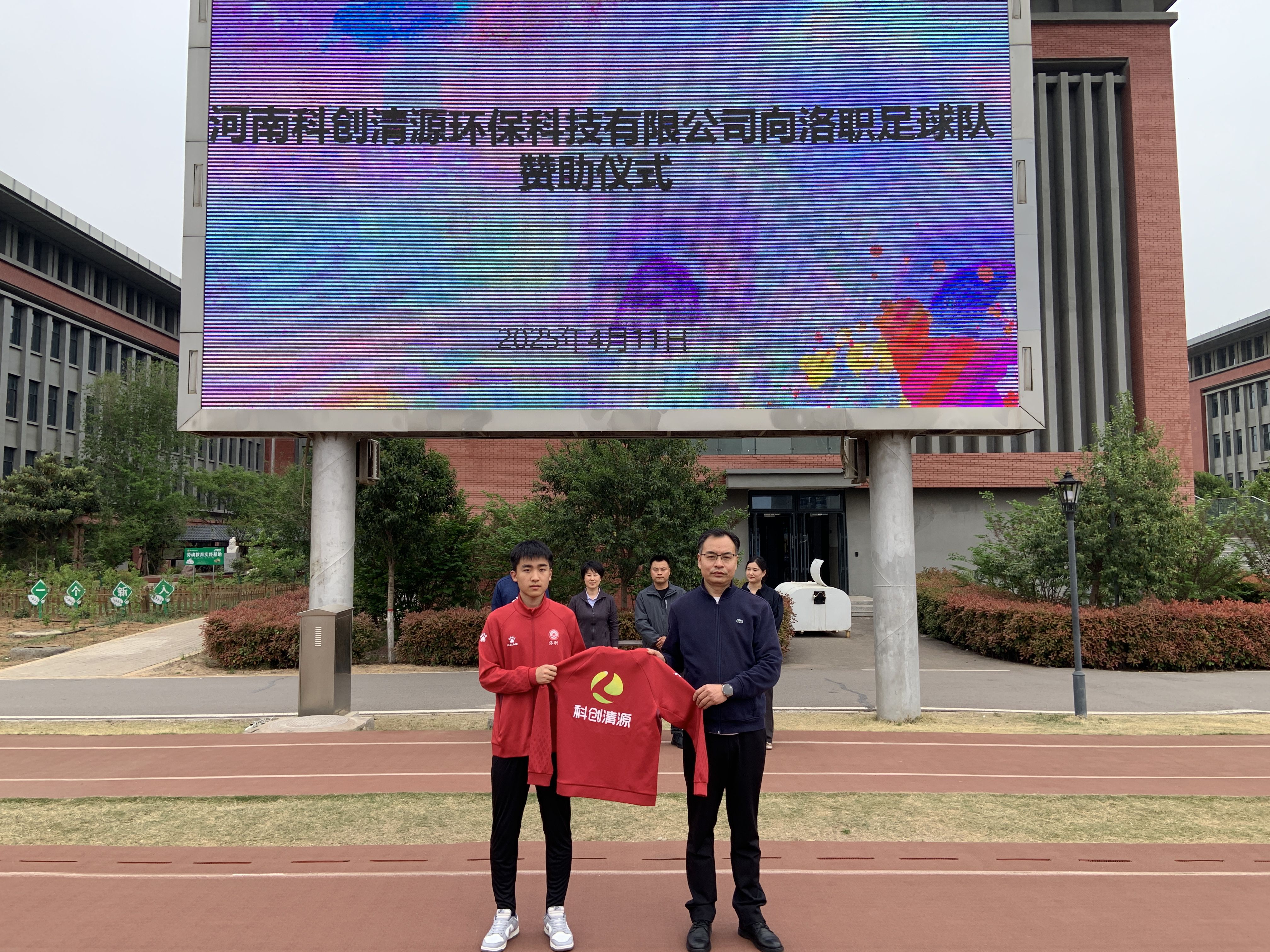 4月11日,河南科创清源环保科技有限公司向洛阳职业技术学院足球队赞助仪式在伊滨校区运动场举行。体育教学部主任王莉、副主任孔阳,河南科创清源环保科技有限公司董事长孙风俭、副总经理邢雯彩,洛职足球队主教练唐泽宇及全体队员参加赞助仪式。