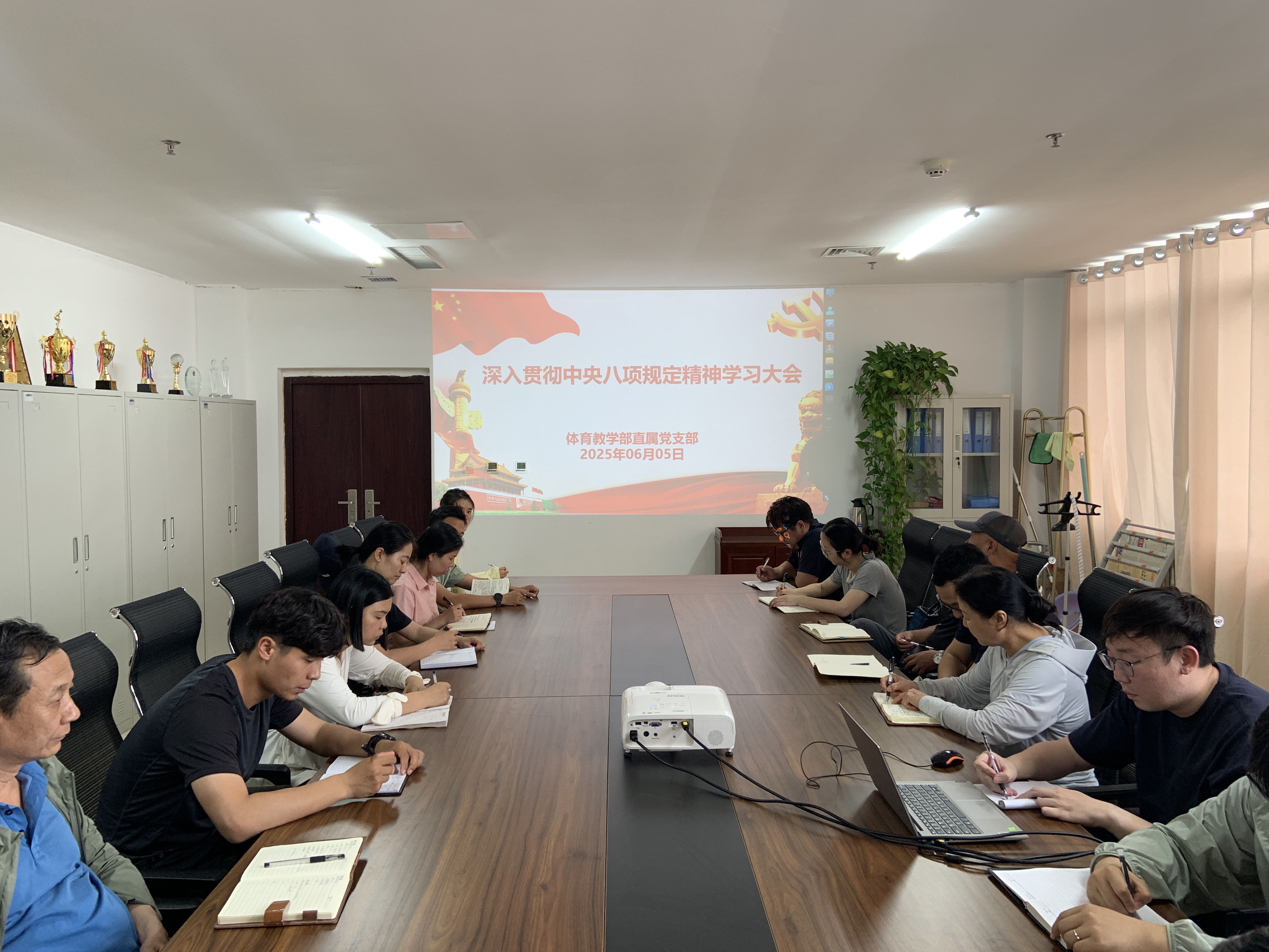 为持续推进体育教学部直属党支部中央八项规定精神学习教育走深走实,6月5日,体育教学部直属党支部组织全体教师在教研室开展深入贯彻中央八项规定精神第三次学习大会,会议由支部书记王莉主持。