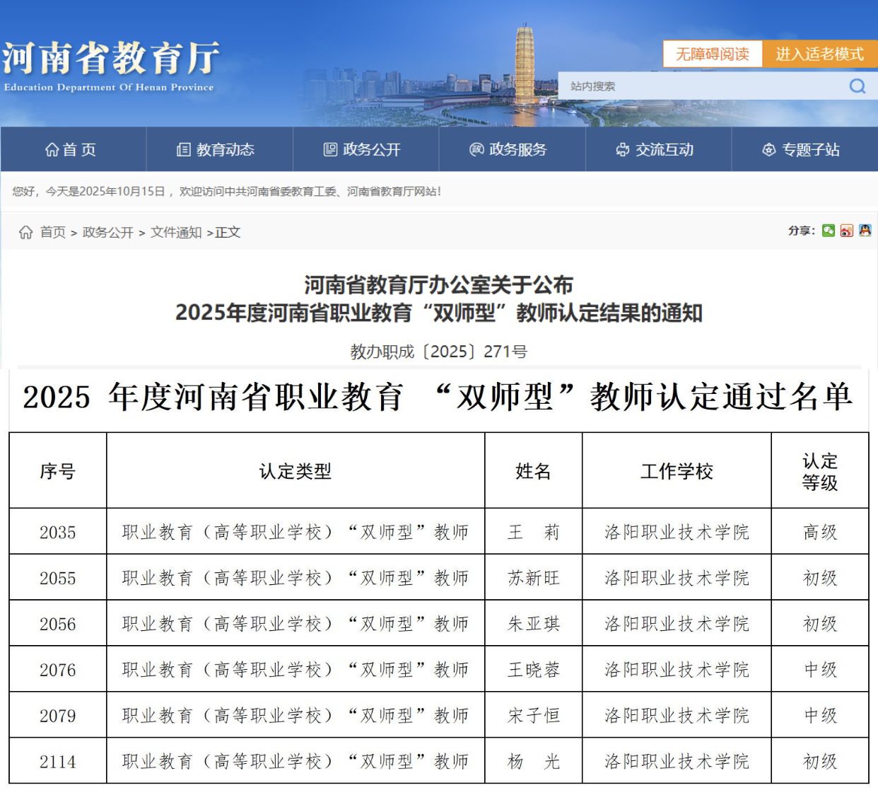 根据《河南省教育厅办公室关于开展2025年度河南省职业教育“双师型”教师认定工作的通知》(教办职成〔2025〕110号)要求,河南省教育厅组织了2025年度河南省职业教育“双师型”教师认定评审工作。